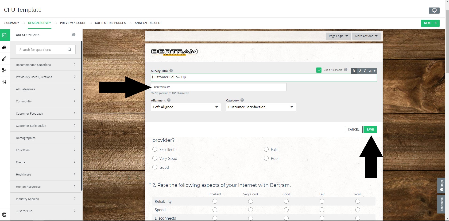 When the survey design survey window loads click on the customer follow up title on the header of the survey.