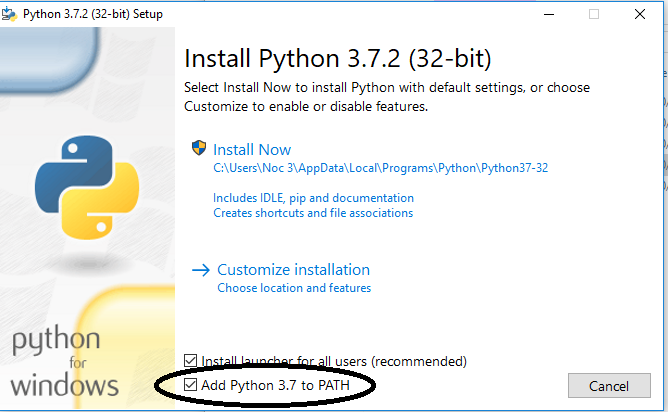 In the downloaded folder, you’ll find Python 3.7.2. Install this with the default options. When you install Python, be sure to check the ‘Add to PATH’ checkbox, as shown below.