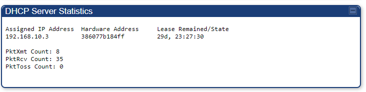 Next, check DHCP Server Statistics. Ensure there is a ‘Hardware Address’ shown, along with a time remaining/state that is less than 30 days. Below is an example of a ‘good’ result.