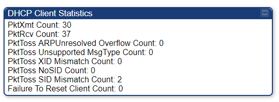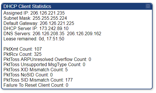First, check DHCP Client Statistics. Ensure that the statistics show a Assigned IP, Subnet Mask, and Default Gateway.