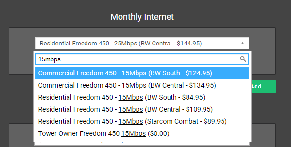 Select the new plan in the menu for ‘Monthly Internet’, then add it. It’s possible to type in this field, to make finding the right one easier. Make sure you select the proper plan type – the correct region, and the correct account type (Residential or Commercial).