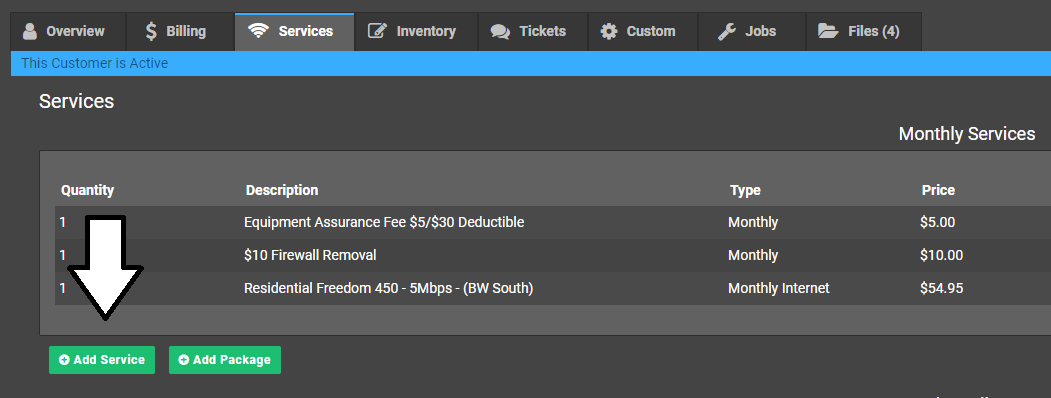 With the customer’s page open, click on ‘Services’ in Powercode, then click on “Add Service”.