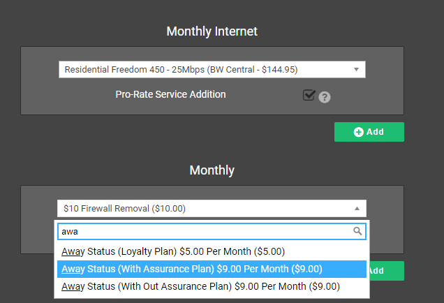 Underneath ‘Monthly Internet’, in ‘Monthly’, click on the box and type ‘away’, then select ‘Away Status (With Assurance Plan) $9.00 Per Month ($9.00)’.