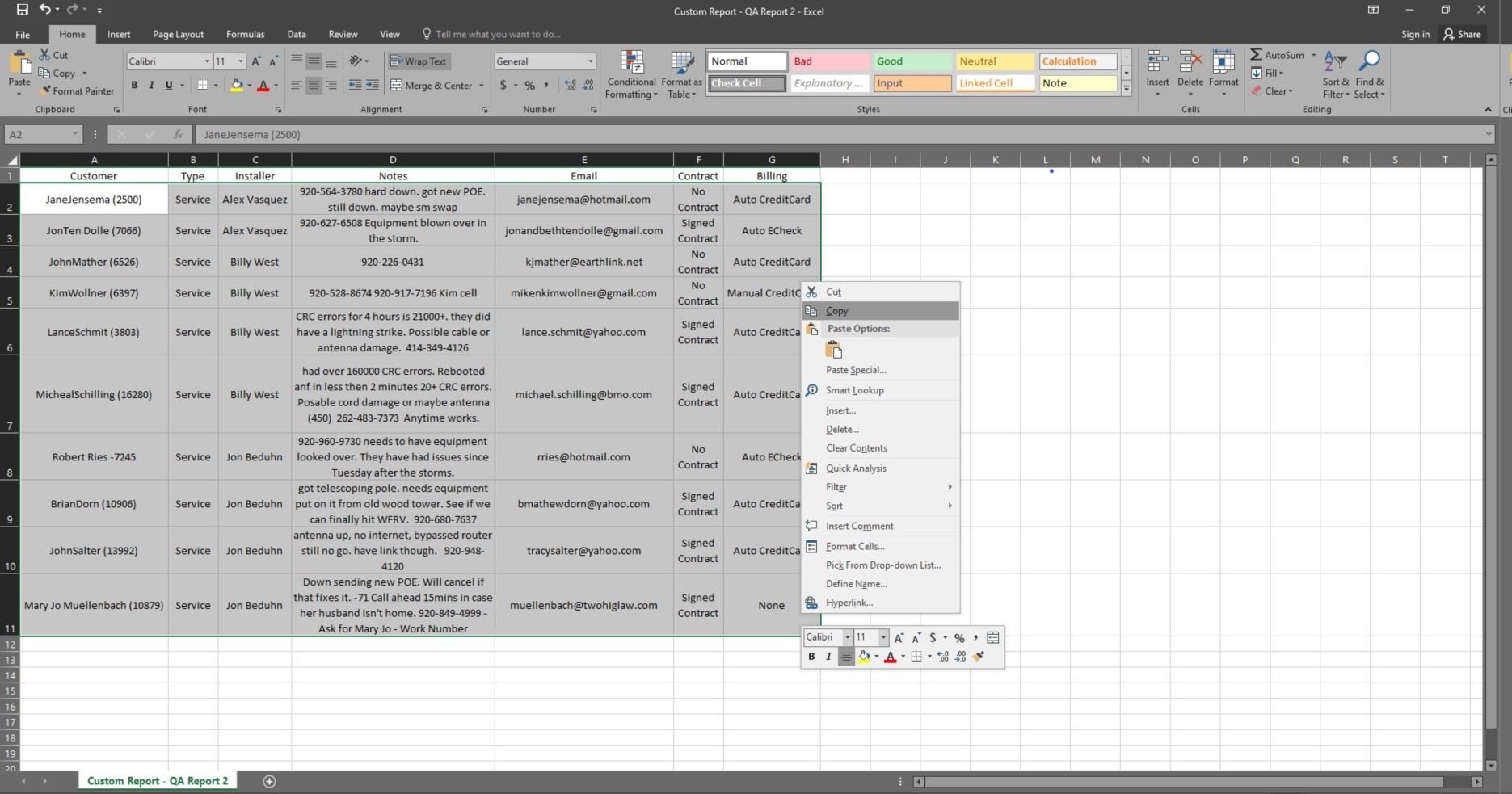 Across the top you will see headers : Customer Type Installer Notes Email Contract Billing QA Call