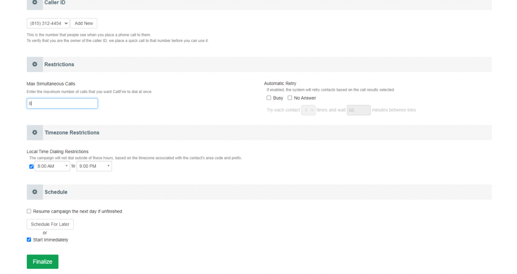 - Under “Schedule” select “Start Immediately”. Rarely do we schedule the Robocaller ahead of time. Below is a picture of the final config screen. Once you have double checked all your settings, Click finalize, and the robocaller will start running.